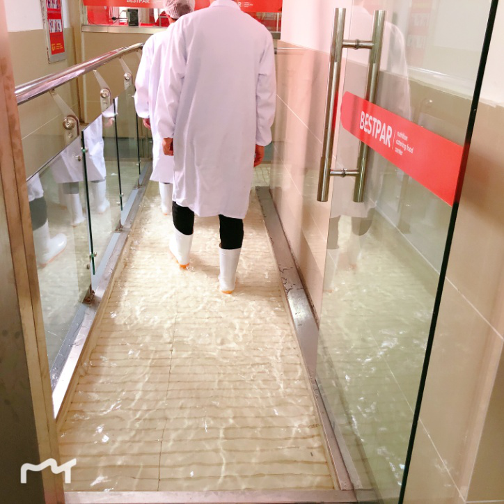 進(jìn)入制餐中心,體溫檢測(cè)合格后,會(huì)進(jìn)入消毒池,對(duì)鞋底進(jìn)行消毒清洗,保證制餐中心的衛(wèi)生與整潔。